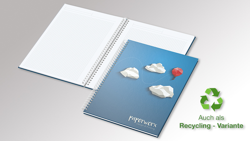 Recycling: A4 oder A5 Format optional aus 100% Altpapier mit dem Umweltzeichen “Blauer Engel” hergestellt.