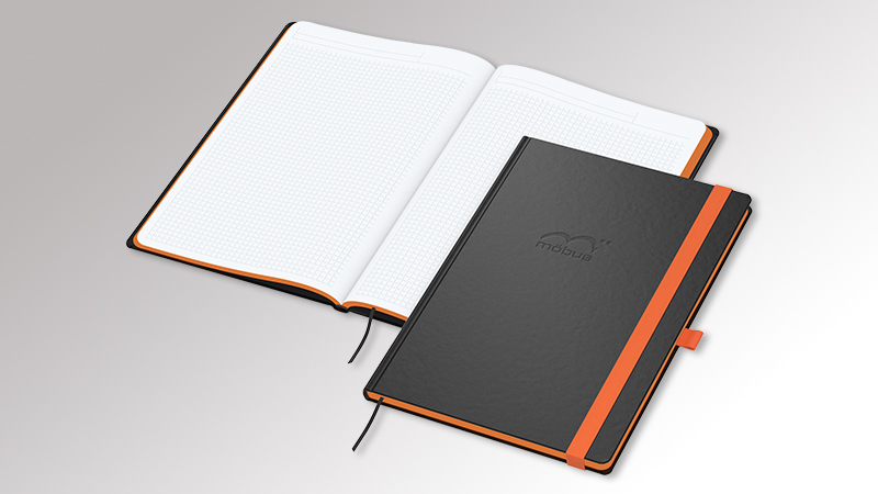 Hardcover mit Einband Tivoli-Soft (samtiges Kunstleder) tiefschwarz · unwattiert · Buchblock und Decke mit runden Ecken · 192 Seiten mit Winkelkaro und Mikroperforation · Hochweißes Schreibpapier 90 g/m2 · Gummiband, Stiftschlaufe und Farb- schnitt gelb, grün, mittelblau, orange oder rot · Vorsatz- und Nachsatzpapier schwarz · Einstecktasche · Lesezeichen · Kapitalband · runder Rücken