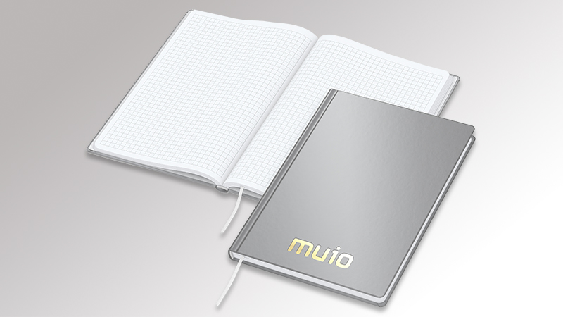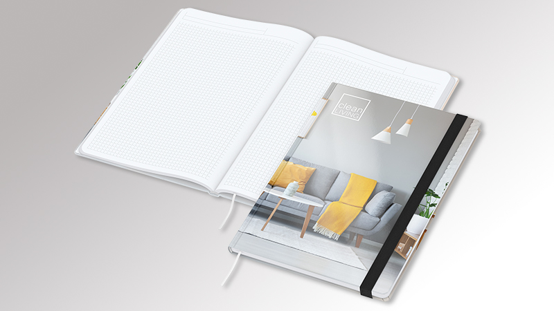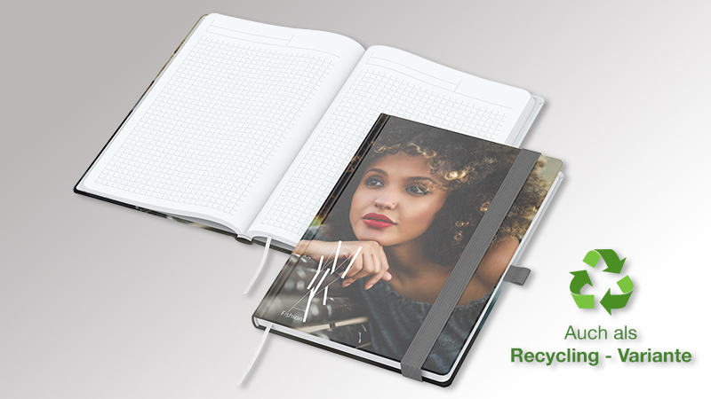 Hardcover mit Einband Cover-Star gloss-individuell (auf Wunsch auch matt) · unwattiert · Buchblock und Decke mit runden Ecken · 192 Seiten mit Winkelkaro und Mikroperforation · Hochweißes Schreibpapier 90 g/m! (Match-Book White) · Cremefarbenes Schreibpapier 90 g/m! (Match-Book Creme) · Gummiband und Stiftschlaufe gelb, grün, mittelblau, orange, rot, schwarz oder silbergrau · Einstecktasche · Lesezeichen · Kapitalband · runder Rücken
