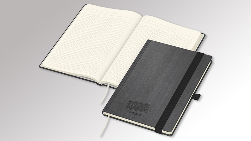 schwarz (matter, unbehandelter Buch- einband auf Zellsto-Basis) · unwattiert · Buchblock und Decke mit runden Ecken · 192 Seiten mit Winkelkaro und Mikro- perforation · Hochweißes Schreibpapier 90g/m2 · Einstecktasche · Lesezeichen · Kapitalband · runder Rücken · Einband mit antimikrobieller PROTECT-Schutz- beschichtung · Informations-Aufkleber separat beigelegt