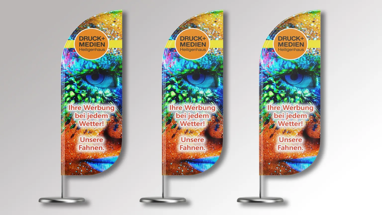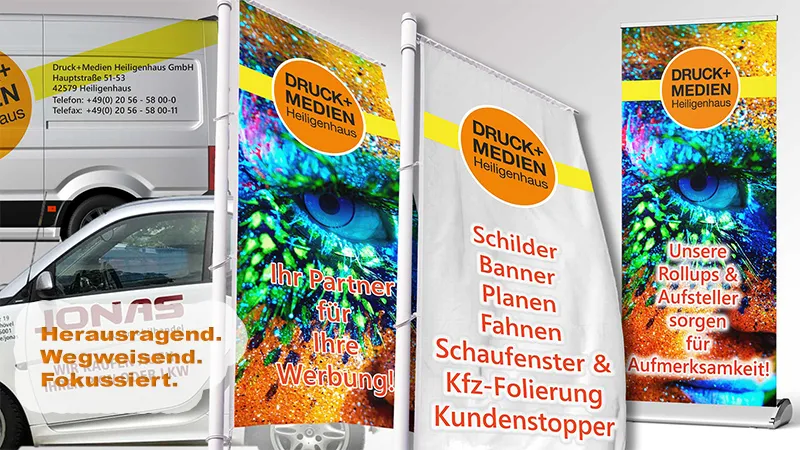 Steigern Sie Ihren Bekanntheitsgrad mit Blickfängern. Angefangen von einer professionellen Beschilderung in und an Ihren Geschäftsräumen über Aufsteller, Kundenstopper, Banner und Flaggen. Bis hin zur Ausrüstung Ihres Messestandes und Beschriftung Ihrer Schaufenster und Fahrzeuge lassen wir nichts aus, um Sie ins rechte Licht zu rücken.